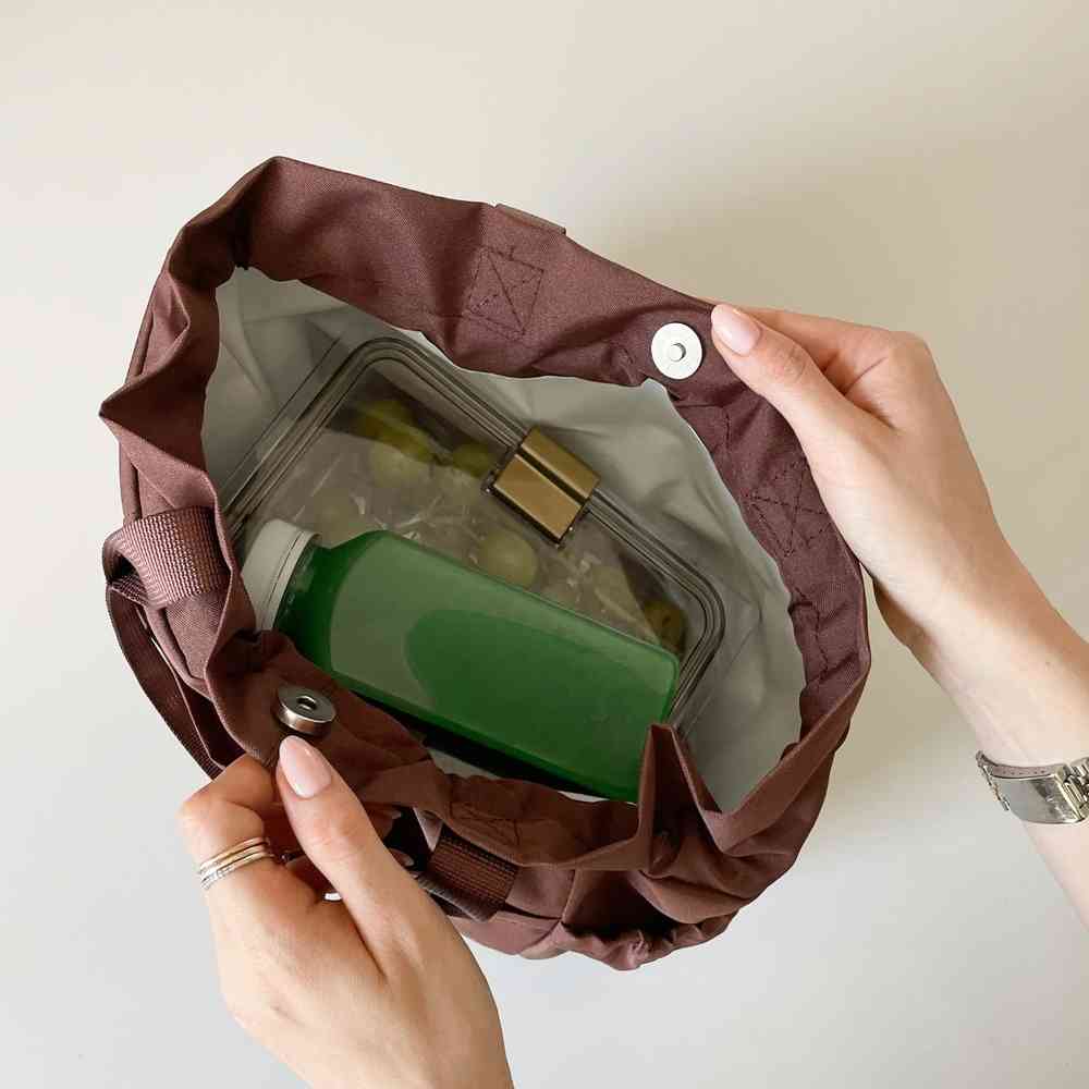Introducing our new Nylon Drawstring Bag - This stylish, structured lunch bag doubles as a chic accessory and a practical cooler with its insulated, wipe-clean interior. Magnetic closures keep your items secure, making it ideal for carrying meals from work to weekend adventures. Effortlessly combining function and fashion.